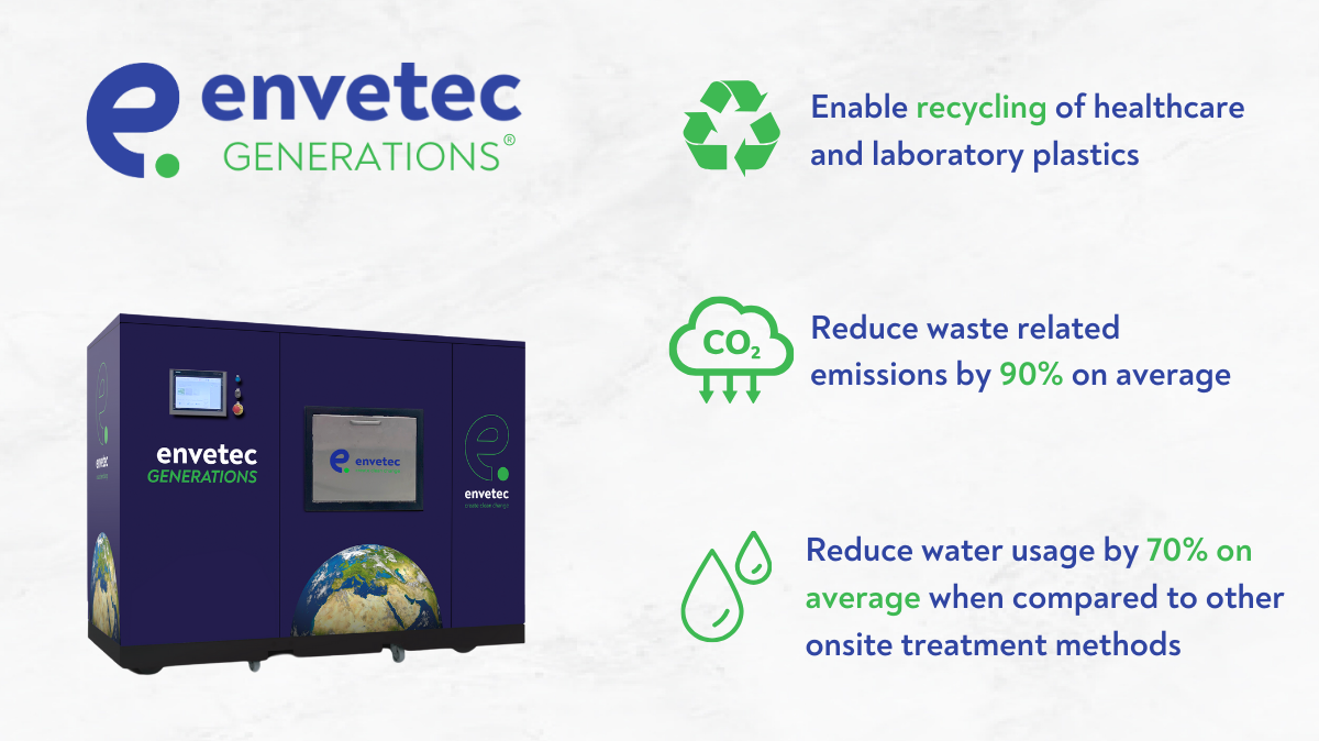 Envetec’s GENERATIONS is a novel technology that simultaneously shreds and disinfects laboratory biohazardous waste. The system’s unique capabilities lead to waste prevention by converting biohazardous and clinical waste into a recyclable polymer flake that is entirely safe to handle and transport for recycling. Independent data shows GENERATIONS can reduce biohazardous waste-related CO2 emissions by 90%.