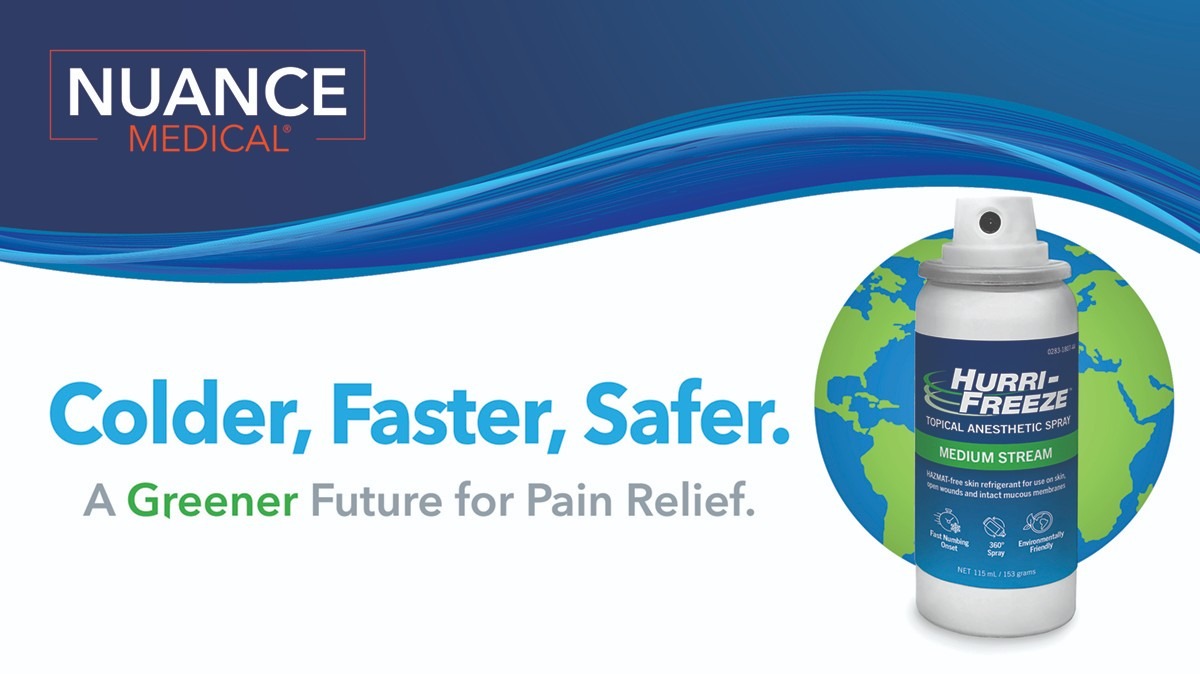 At Nuance Medical, we’re committed to safety, sustainability, and quality in everything we do and every product we deliver. Our new Hurri-Freeze topical anesthetic spray has a GWP (Global Warming Potential) 99% lower than HFC topical anesthetic sprays. It’s a safer alternative to Ethyl Chloride, a better experience for patients, and a better choice for the planet.